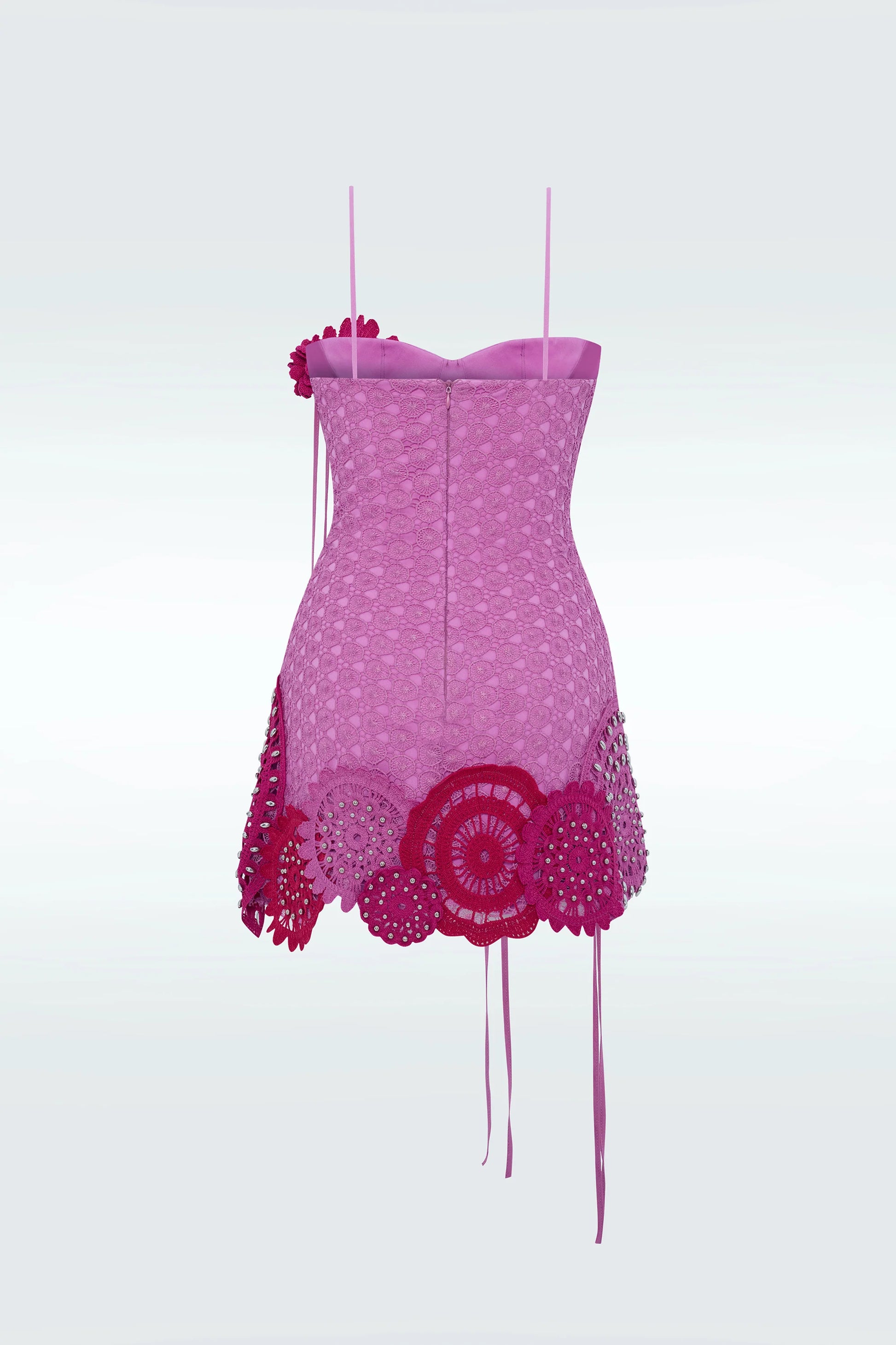 Mini broderie dress with asymmetrical hand embellished delicate broderie pieces.