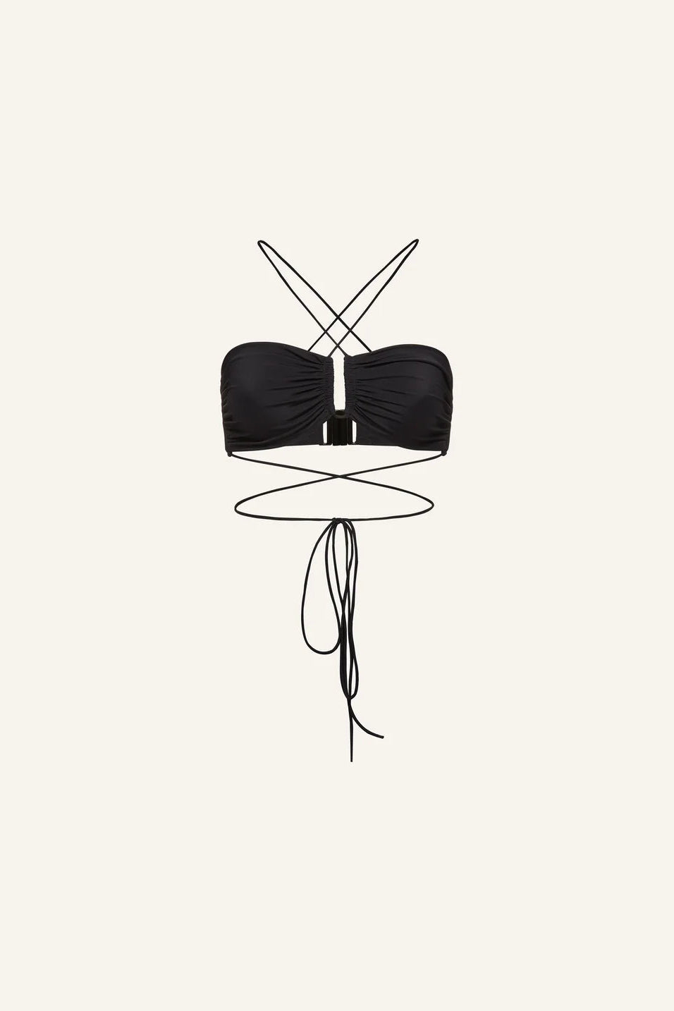 A bandeau style top which joins together in the middle with strings to creat a keyhold sort of opening. The straps create a crisscross detail at the chest and in back, as well as underneath the bra on the abdomen.