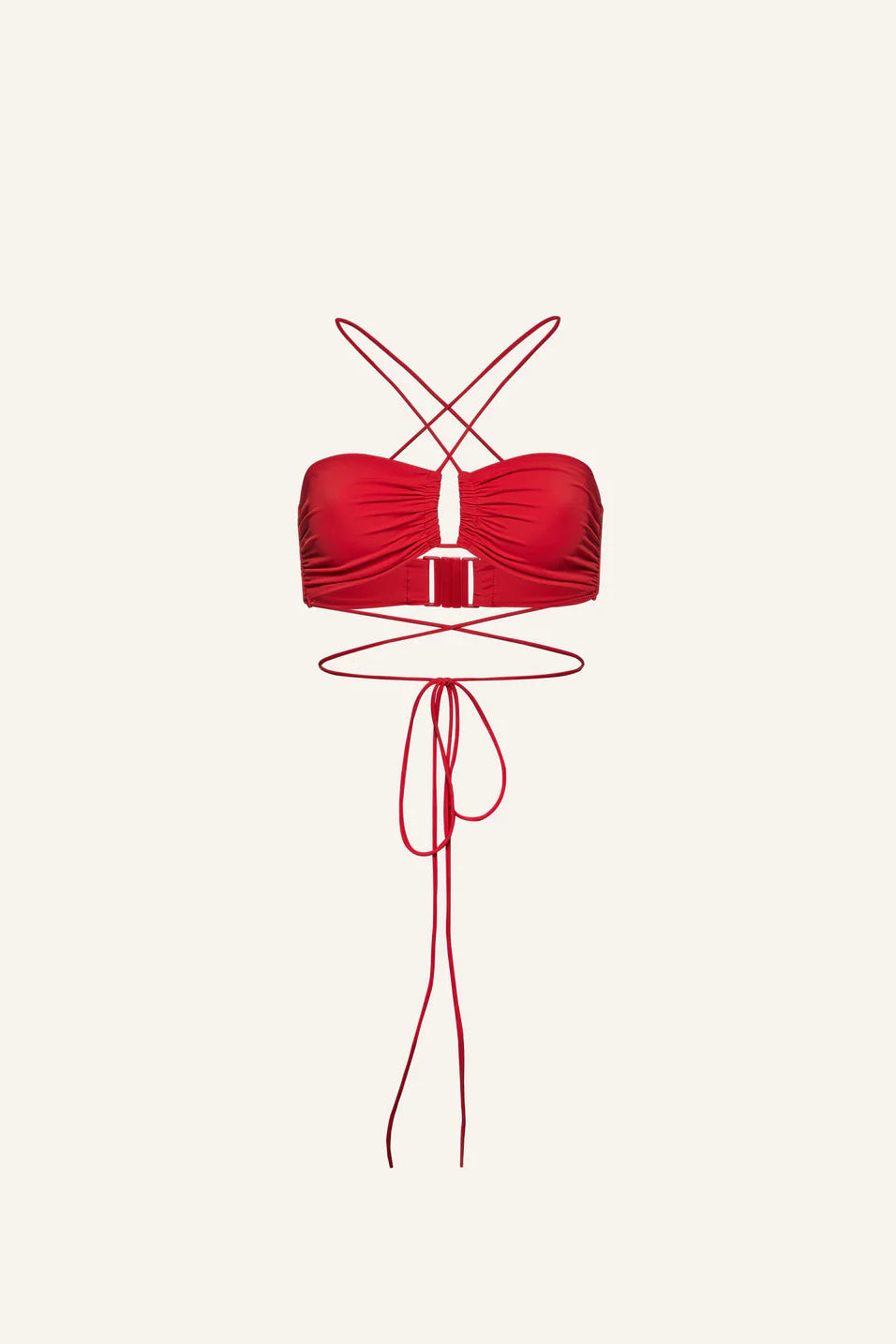 A bandeau style top which joins together in the middle with strings to create a keyhold sort of opening. The straps create a crisscross detail at the chest and in back, as well as underneath the bra on the abdomen.