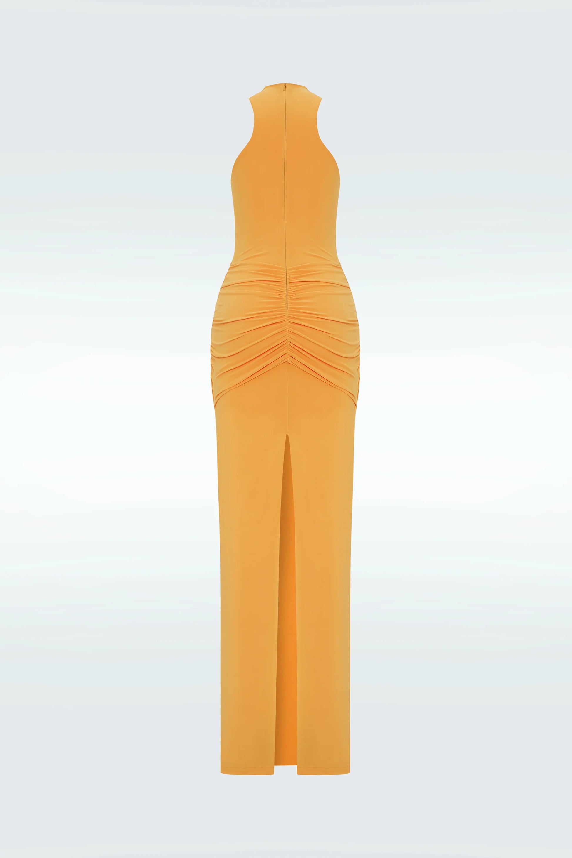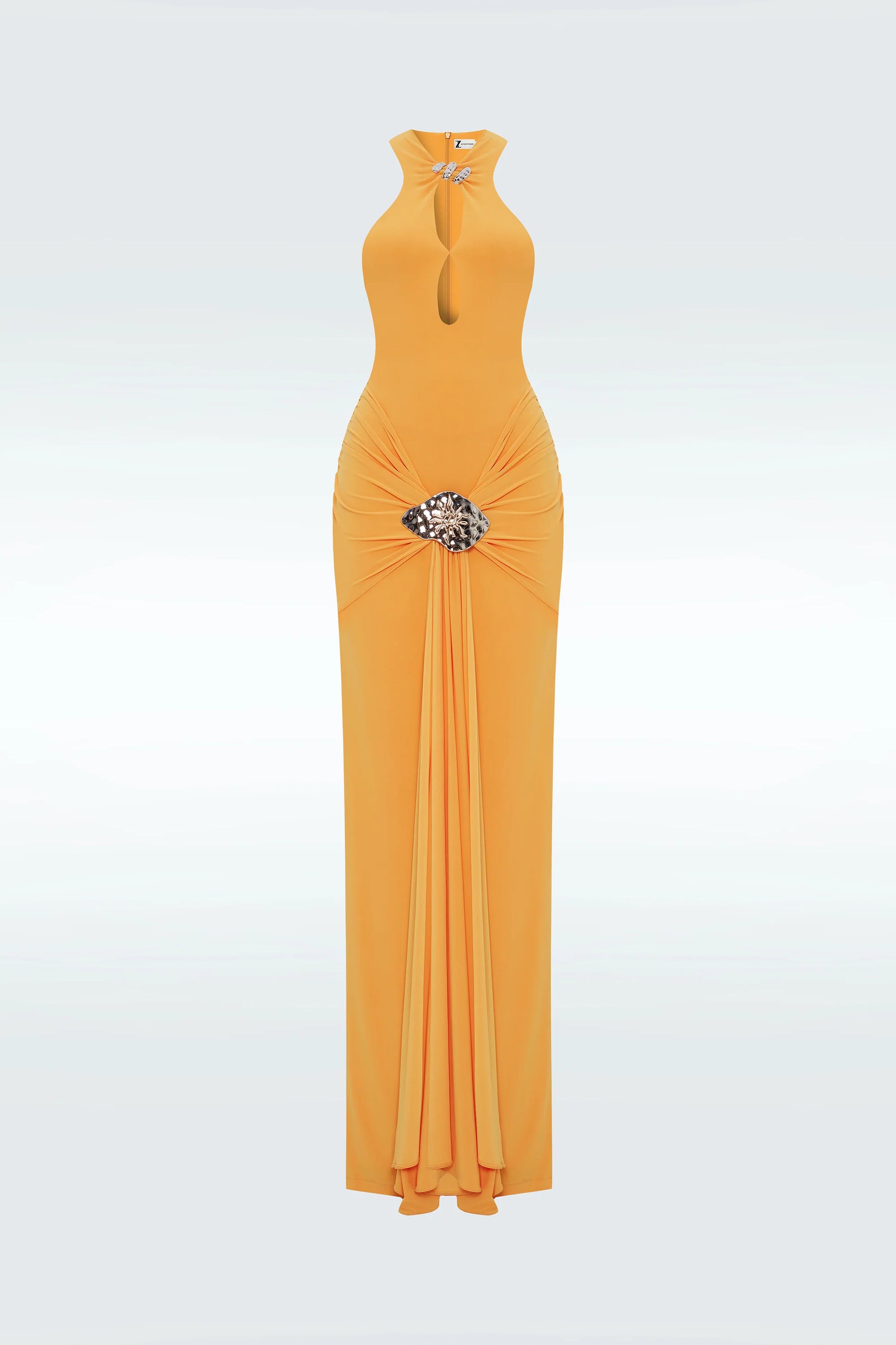 Full length jersey dress with metal accessory.
