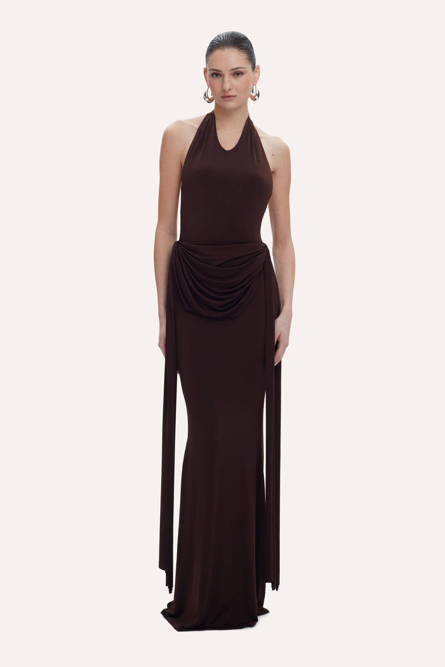 This maxi dress features a mermaid hem and a signature draped nautilus belt that cinches the waist with grace.The open back delivers a striking contrast to the dress’s graceful lines. Designed for a flawless fit and effortless movement.