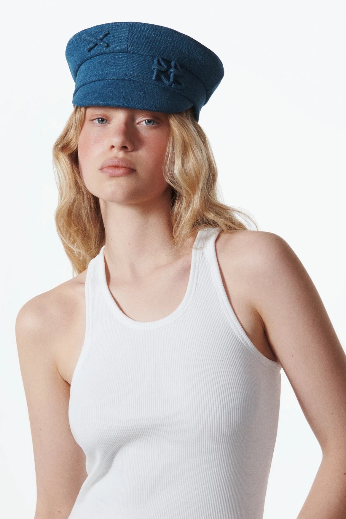 Logo-embellished Denim Baker Boy cap with cotton exterior and lining in blue, showcasing an artisanal approach.