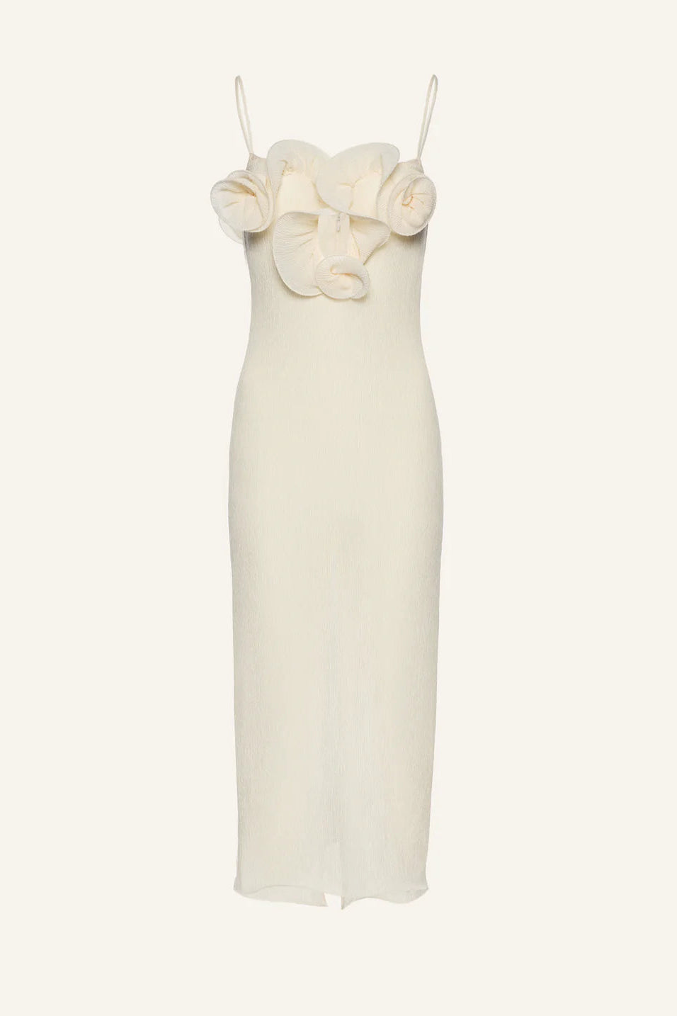 Magda Butrym’s beachwear offering includes a signature crepe fabric midi dress with floral ruffle detailing at the chest to create a deep neckline, available in an updated rendition with spaghetti tank straps.